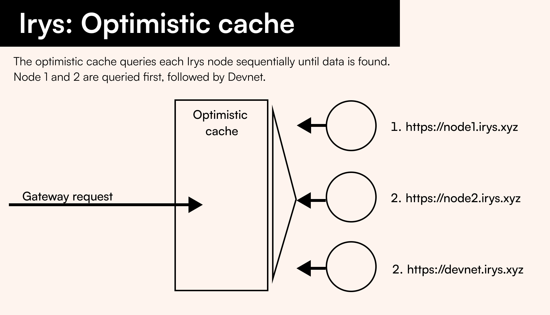 The optimistic cache queries each Irys node sequentially until the data is found. Node 1 and 2 are queried first, followed by Devnet. If the data is found, it is returned instantly. Otherwise, a 404 code is returned.