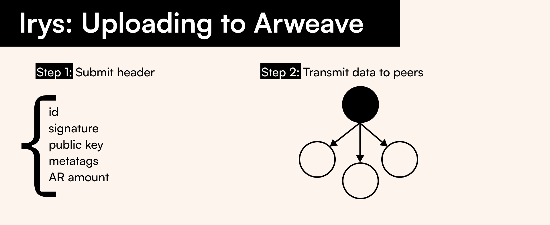 In addition to submitting the transaction header, Irys also submits your data to a network of miners. In general, your data is submitted to a minimum of 10 miners and is guaranteed to be seeded to a minimum of 3 miners.