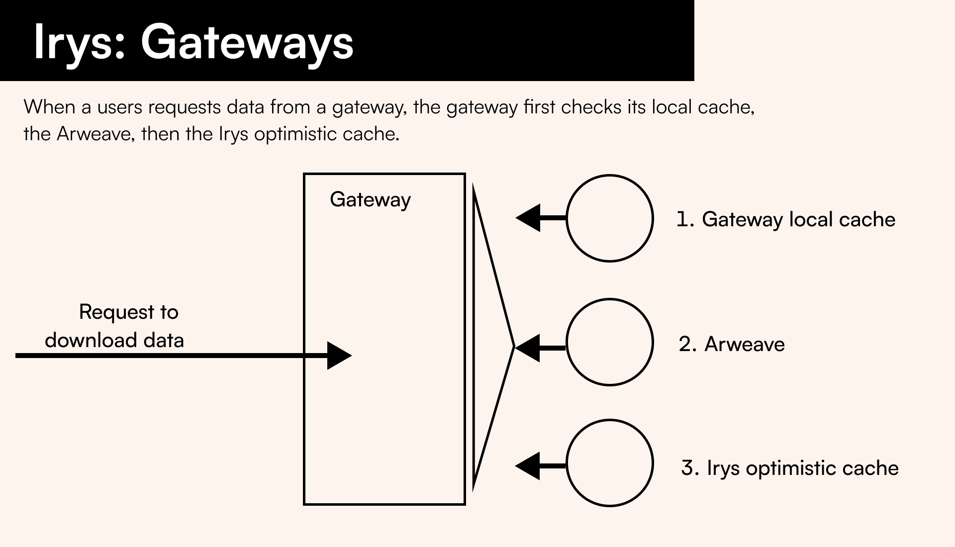If the data is not found on Arweave or the gateway’s local cache, the gateway checks Irys' optimistic cache to see if the data is available. By doing this, the gateway allows for instant access to data uploaded to Irys, even if it hasn't been finalized on Arweave. This also means data uploaded to Irys' Devnet, where uploads are kept for approximately 60 days, is available via gateways.